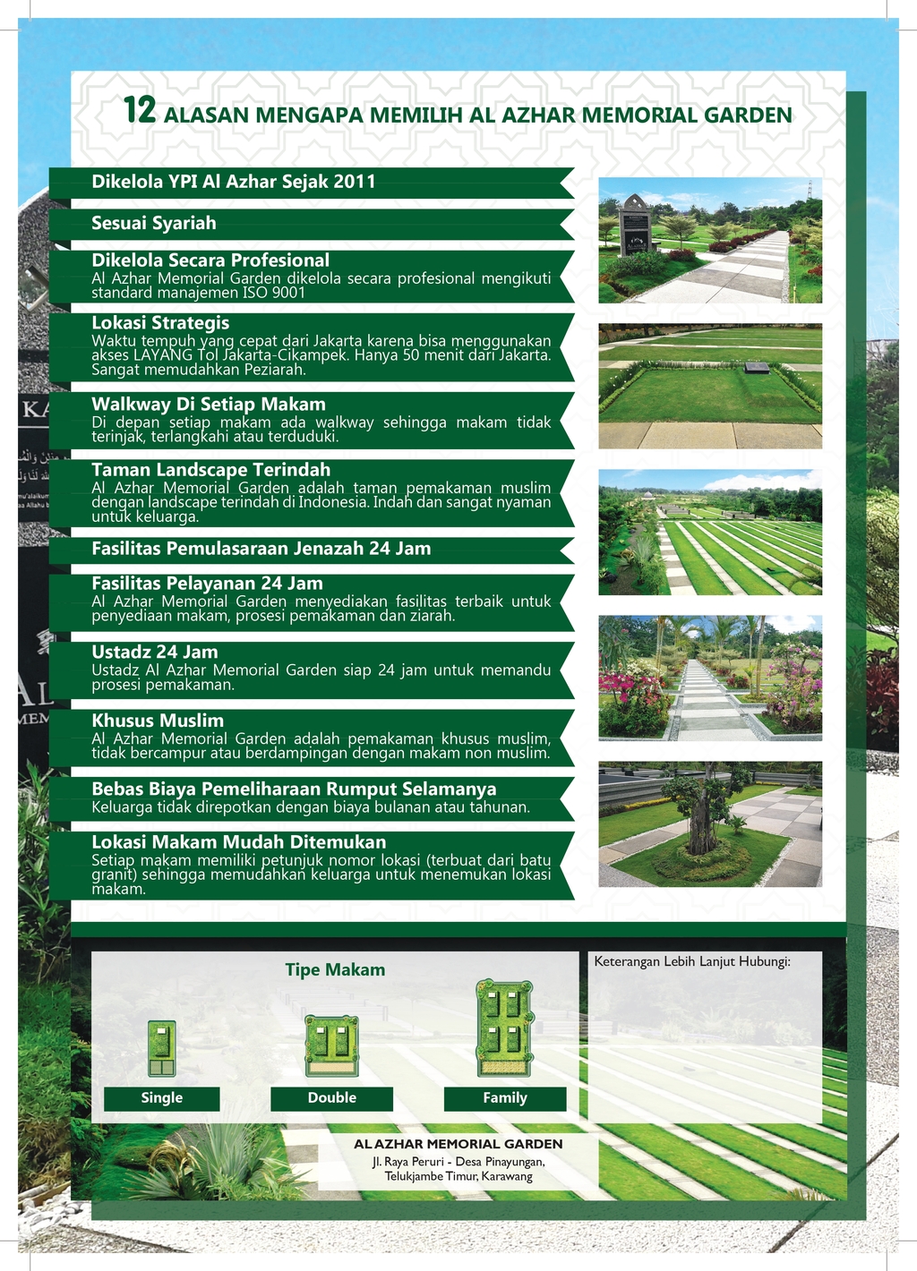 Al Azhar Memorial Garden merupakan taman pemakaman muslim no 1 di Indonesia yang terletak di Karawang, Jawa Barat. Taman pemakaman ini merupakan kolaborasi antara Yayasan Pesantren Islam Al Azhar dengan PT. Nuansa Usaha Mandiri. Sejak tahun 2011 kami telah membantu khusus umat muslim dalam menyediakan lahan makam hingga pelaksanaan prosesi pemakaman. Semua pelayanan dilakukan secara profesional mengikuti standar manajemen ISO 9001.